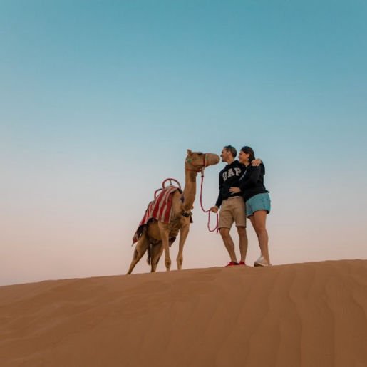 Experience the fun of riding as part of a cool camel caravan while you explore the vast desert dunes