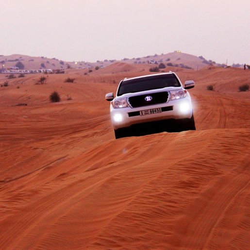 This evening desert safari tour in Dubai includes exhilarating activities like dune bashing, camel riding, and sandboarding.