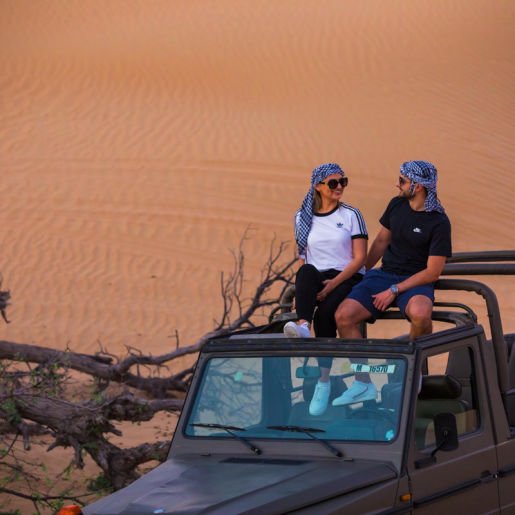 After arriving at Al Marmoom Desert Reserve, hop into a vintage 1980s G-Class Mercedes for a romp across the reserve’s dunes. Don’t worry about capturing the moment, you’ll take a break in the desert for a photo.